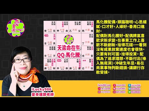 805 Tencent騰訊Pony  Ma Huateng馬化騰QQ錢包微信支付名人紫微斗數命盤iLucky986愛幸運紫微斗數命理資訊顧問p1,馬化騰命宮坐天梁,天鉞文昌化忌,個性保守,頭腦聰明,善於謀略,固執好面子。 文昌生年忌在命宮,自我意識強(從自己角度看事情),文藝,文書宣傳上缺少靈活,保守好面子(天梁),缺乏創新,容易神經緊張。805 Tencent騰訊Pony  Ma Huateng馬化騰QQ錢包微信支付名人紫微斗數命盤iLucky986愛幸運紫微斗數命理資訊顧問p2,命宮化祿到父母宮,對父親好,喜歡大眾投資他生意。對朋友恩威並施。要靠他人創新和別人成功和得到好評的生意模式應用自己企業工作環境上。馬化騰出外心情好,喜歡在外面表現霸氣,一心想要往外 到處跑。 文昌生年忌坐命宮,容易有文書擔保,背書,票據,罰款,訴訟是非。 805 Tencent騰訊Pony  Ma Huateng馬化騰QQ錢包微信支付名人紫微斗數命盤iLucky986愛幸運紫微斗數命理資訊顧問p3,從父母宮四化來看,大眾會把錢給馬化騰想透過他謀略頭腦才華去賺更多的錢,目的是會要從馬化騰的錢財使自己獲得利益。大眾對馬化騰錢財的投資,如同雙刃刀,大眾給他機會,投資他,對他錢財帶來好處讓他能夠實現理想。最終目的也是要大眾自身得到錢財,會對馬化騰的錢斤斤計較,讓馬化騰無福可享。805 Tencent騰訊Pony  Ma Huateng馬化騰QQ錢包微信支付名人紫微斗數命盤iLucky986愛幸運紫微斗數命理資訊顧問P4,QQ之父騰訊集團馬化騰巨門生年祿坐夫妻宮,福德宮化天同祿入官祿宮,這是對峙祿。這是配偶和配偶事業對馬化騰有加倍好處。  馬化騰的配偶,頭腦聰明,心思細膩,口才好,人緣好,善於用口進財,配偶對馬化騰好。配偶脾氣喜歡求新求變,在事業工作上喜歡不斷創新,捨得花錢,一看到沒有成果放棄速度也會很快。只要有利可圖,捨得投資。 配偶為了追求理想,不斷付出(祿入無底洞),沖破生年忌,易在商業事物判斷錯誤,讓銀行存款受損。805 Tencent騰訊Pony  Ma Huateng馬化騰QQ錢包微信支付名人紫微斗數命盤iLucky986愛幸運紫微斗數命理資訊顧問P5,夫妻宮生年祿轉祿入命宮,在24到33歲(夫妻宮大限命宮),配偶對馬化騰有實質幫助。馬化騰與配偶認識在2004年虛歲24歲,在2005年結婚,虛歲25歲。805 Tencent騰訊Pony  Ma Huateng馬化騰QQ錢包微信支付名人紫微斗數命盤iLucky986愛幸運紫微斗數命理資訊顧問P6,忌轉忌入遷移宮,自己缺乏創新,要靠別人創新和獲得成功生意模式,自己拿來用(生年權),不以為意(自化祿),他在64到73歲會發生文書方面問題如侵權等而影響他事業,為他帶來糾紛是非。Wordpress1440x221_2018iLucky986愛幸運紫微斗數命理資訊顧問-1,運氣是個旋轉門,你要知道何時走進去。讓我用紫微斗數告訴你如何賣掉危機,買進機會。人生如棋局,看你如何善用棋子調兵遣將,化干戈為玉帛。iLucky986愛幸運紫微斗數不只看星性,更用宮干四化看人生運勢起伏,透過紫微斗數命盤為你的人生做價值投資分析。 作為一位專業的紫微斗數命理資訊顧問,依照你的紫微斗數命盤我為你分析你的個性行為思考模式,您周圍親友對你的不同大限起伏,利害提供對你人生有利的資訊幫助你做抉擇。不論你是感情,婚姻,子女學業,出生子女命名,事業,工作,合夥人的選擇等等,我都在此為你的人生規劃藍圖提供建議。有我的協助,可以為你避開您人生的絆腳石,讓你穩操勝算。透過瀏覽我們的網頁,讓你更了解我們的服務。別忘了,關注我們的iLucky986愛幸運紫微斗數臉書粉絲隨時接收訊息,有工作感情抉擇問題立刻採取行動預約時間。